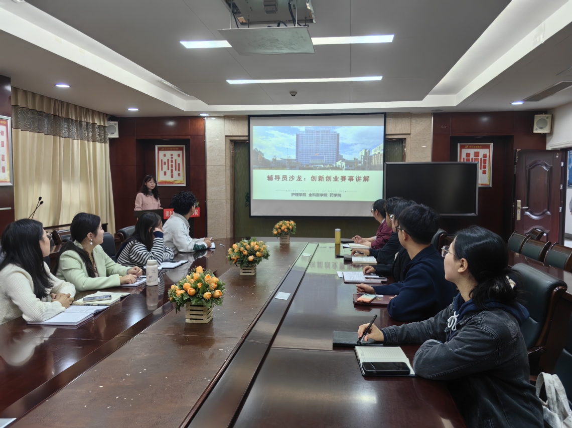 本网讯(通讯员 沈锐)为激发学生的创新创业热情,提升各学院在“挑战杯”、“中国国际大学生创新大赛”等高水平赛事中的项目质量和竞争力,10月16日,jinnianhui今年会联合全科医学院、药学院举办了辅导员沙龙之创新创业赛事专场培训在8号楼二楼会议室成功举办。jinnianhui今年会院领导、班主任、三个学院全体辅导员参与了本次活动。沙龙由jinnianhui今年会沈锐主讲。
