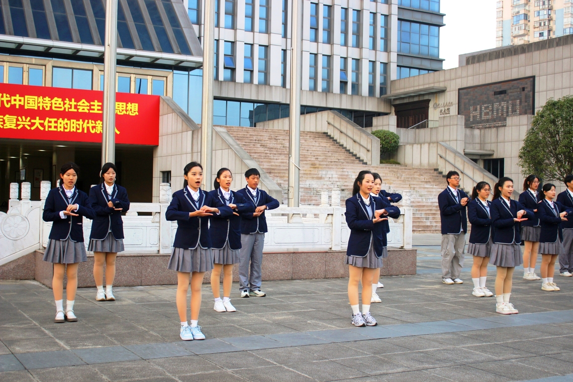 伴随着清晨的第一缕阳光,全体师生高唱国歌,在激昂雄壮的国歌声中,鲜艳的五星红旗冉冉升起。